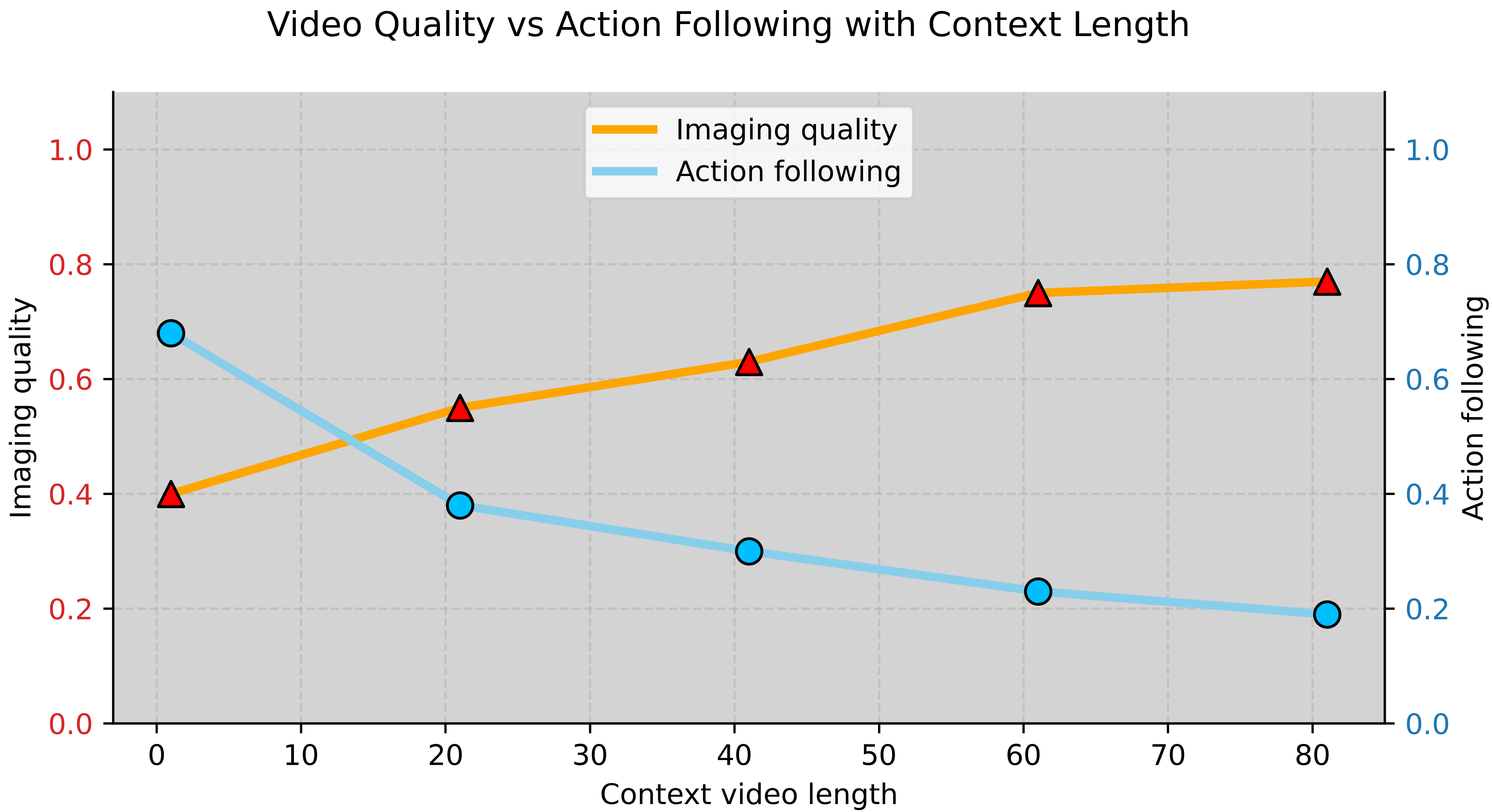 As the history length increases, video quality improves, but the action-following score drops sharply, illustrating the visual inertia phenomenon. This motivates our designs in Astra.