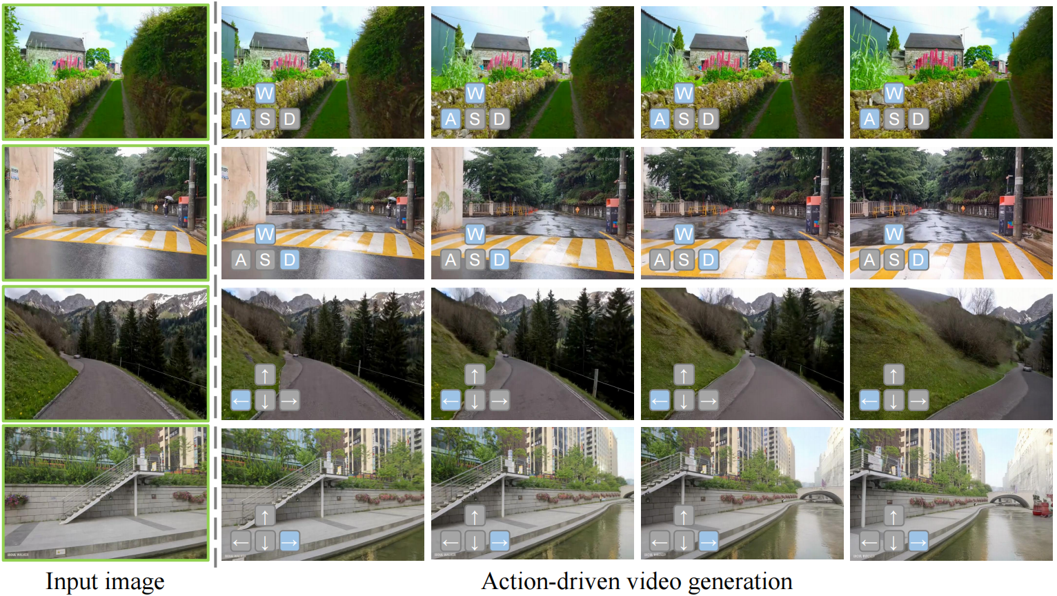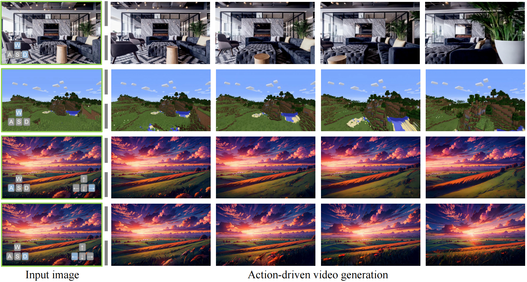 Astra generalizes to scenes not seen during training, including indoor environments, Minecraft worlds, and animation-style scenes, producing coherent futures that follow camera or navigation commands