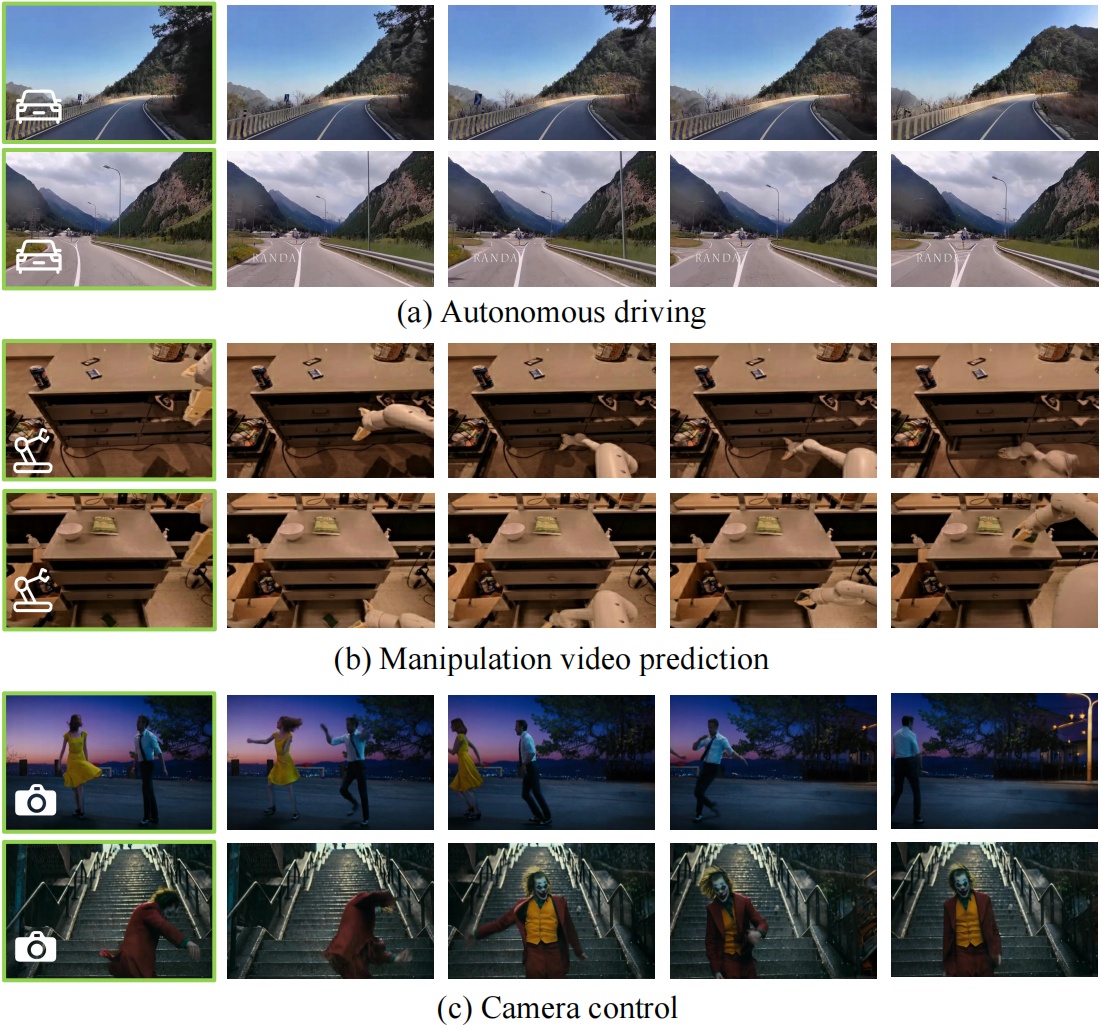 Our framework handles diverse scenarios: (a) autonomous driving, predicting long-horizon traffic dynamics from control inputs; (b) manipulation, conditioning robot actions on object interactions; and (c) camera control, reflecting viewpoint changes in coherent videos. These demonstrate Astra's versatility for interactive world modeling.