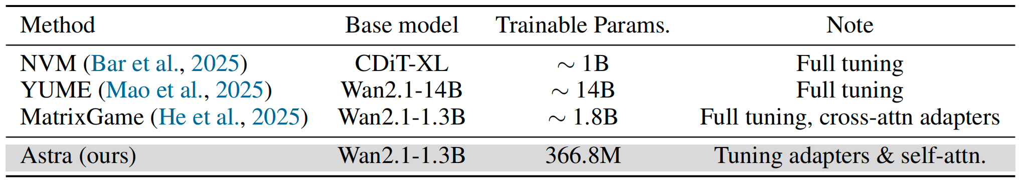Astra's future work includes releasing full inference pipelines for additional scenarios such as autonomous driving and robotic manipulation, open-sourcing our data processing utilities and training code for broader reproducibility, and developing a higher-resolution version of Astra by integrating more advanced generative backbones such as Wan 2.2.